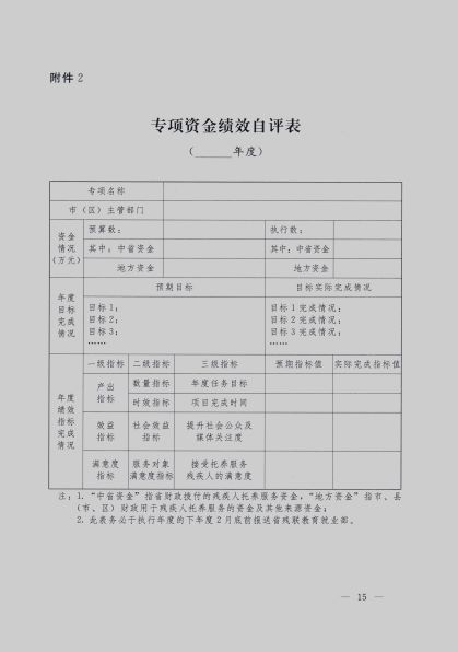 每年项目执行结束后,各市(区)残联应对照确定的绩效目标开展绩效自评,填写《专项资金绩效自评表》(见附件),形成相应的自评结果,于下年度2月底前报送省残联。该自评结果将作为以后年度资金分配的前置条件和重要因素。