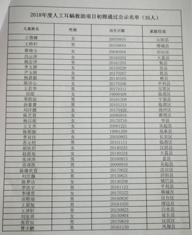 按照2018年人工耳蜗救助项目要求,现将申请救助的35名通过项目专家组审核的救助聋儿基本信息,予以公示。如对公示有异议,请与陕西省听力语言康复中心人工耳蜗项目办公室联系。 公示时间:2018年4月4日至2018年4月10日 联系电话:029-86399910